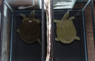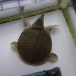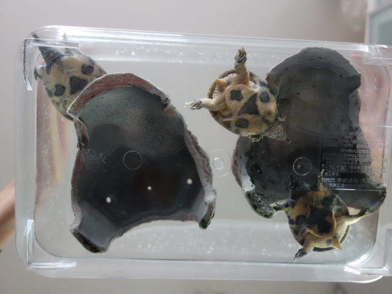 ↑アイキャッチ画像は飼育容器の下から撮った飼育245日(2022年8月3日保護)の3匹の赤ちゃんスッポン。もう8ヶ月経った上、腹甲もさほど赤くないので赤ちゃんスッポンとは言えないかもしれませんが、他に呼びようがないので(子スッポン?)便宜的にまだ「赤ちゃんスッポン」と呼ぶことにします。今日置き去りにしてしまって6時間後に捜し出すことができたのはこの写真では真ん中の1匹です。(2023年4月5日16:40撮影)