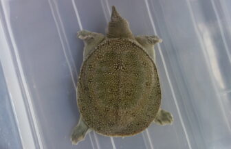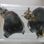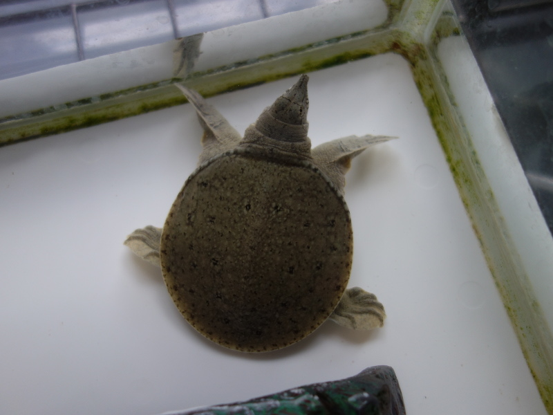 スッポンの甲羅は普通楕円形ですが、このスッポンは正円に近い形をしています。甲長が4cmぐらいの頃は私が持っているCDウォークマンのリモコンの丸い部分とほぼ同じ大きさで、そっくりでした。