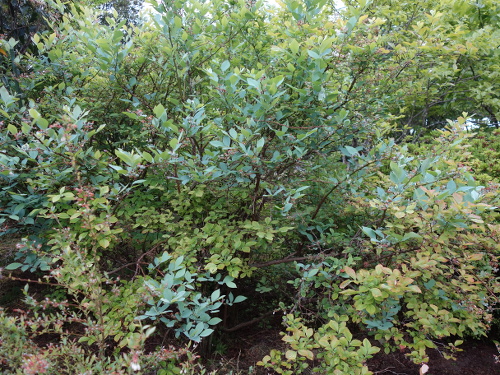 3種類の品種(エッセルとティフブルーとホームベル)が混み合っている中で、葉っぱが青っぽいのがティフブルー。