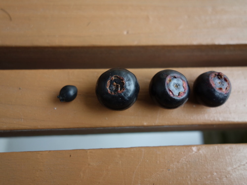 ビルベリーと一緒に並べてみました。左端がビルベリー。残りの3個はティフブルー。大きさの違いが歴然です。味はビルベリーの勝ちです。