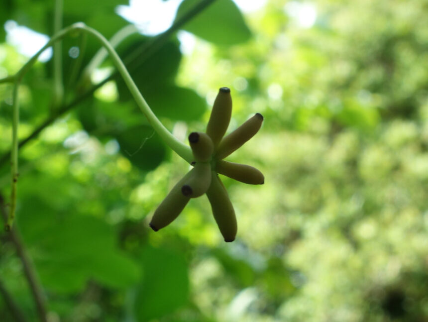 庭の畑に植えている三つ葉アケビの蔓に実が生っていました。 (2023年5月3日14:34撮影)