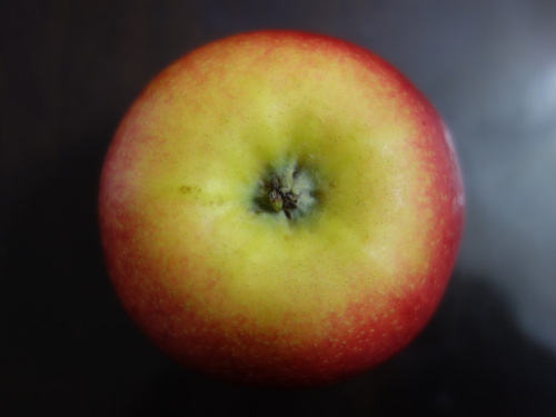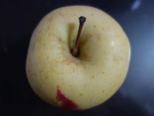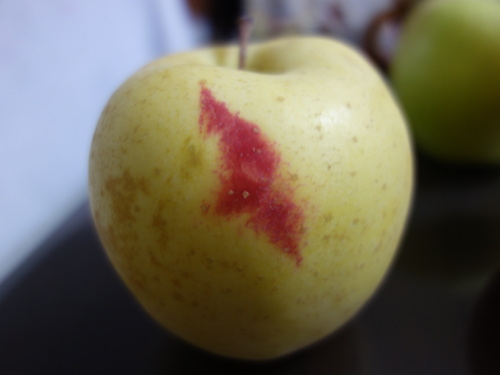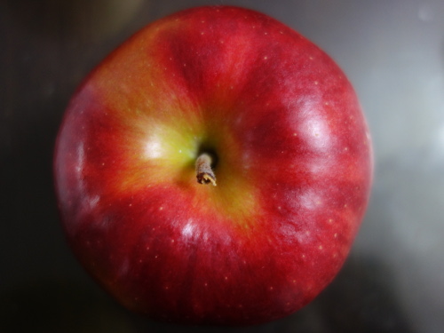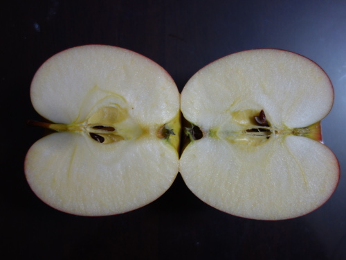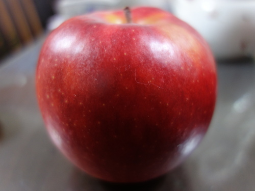 鮮やかな赤いりんごで、表面にワックスが滲み出ています。そのためヌルヌルしていました。光沢があるので、蛍光灯でも輝いて見えます。程よい酸味があって、甘さ控え目、柔らかく食べやすいりんごです。見た目では最も美味しそうに見えます。私の持っているイメージは子供の頃に食べたりんごの味です。