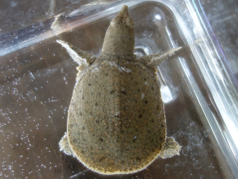 2022年6月上旬に卵を産み落とされ、7月下旬に孵化したと思われる2匹目(No.67)のスッポン幼体の背甲。保護時の甲長3.0cm。No.66と兄弟と思われるが、甲長が4mm大きいのと、腹甲のへその緒の状態から考察すると、No.66よりも数日早く孵化した可能性が高い。