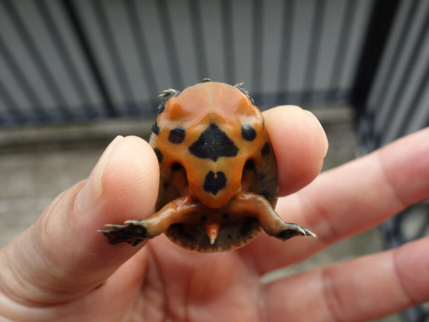 近所の水が少なくなくなった用水路で保護した1匹の赤ちゃんスッポンの腹甲。