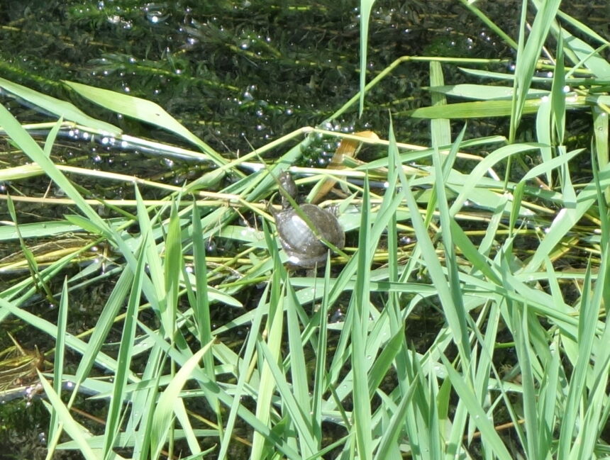 2025年8月12日に水の減らされた用水路でアナカリスに乗って日光浴をしていた保護2匹目の赤ちゃんスッポン。(2025年8月12日11:10撮影)