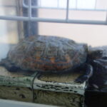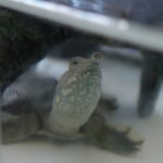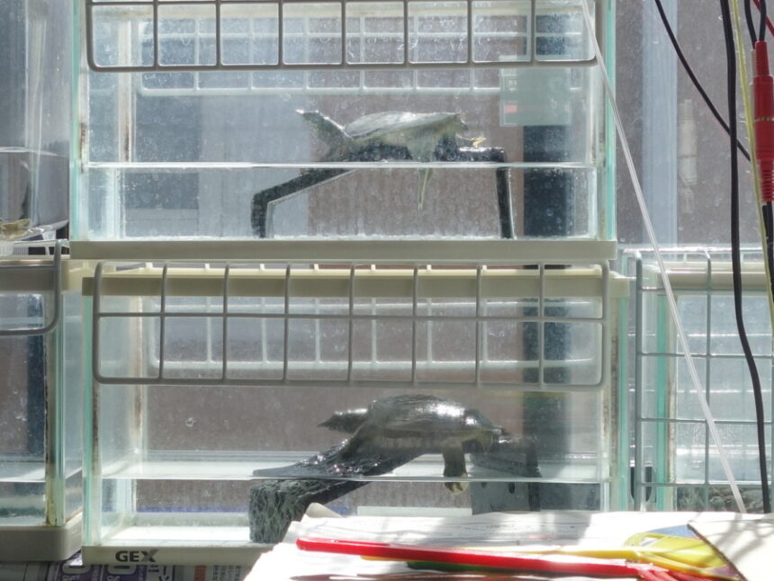 ↑アイキャッチ画像は飼育294日の赤ちゃんスッポン3匹のうちの2匹がガラス水槽の中で甲羅干ししているところ。上が2024年に保護した4匹の赤ちゃんスッポンの中で現在2番目に成長している個体(2024年保護4匹目)。下が丸剤最も成長している個体(2024年保護3匹目)。