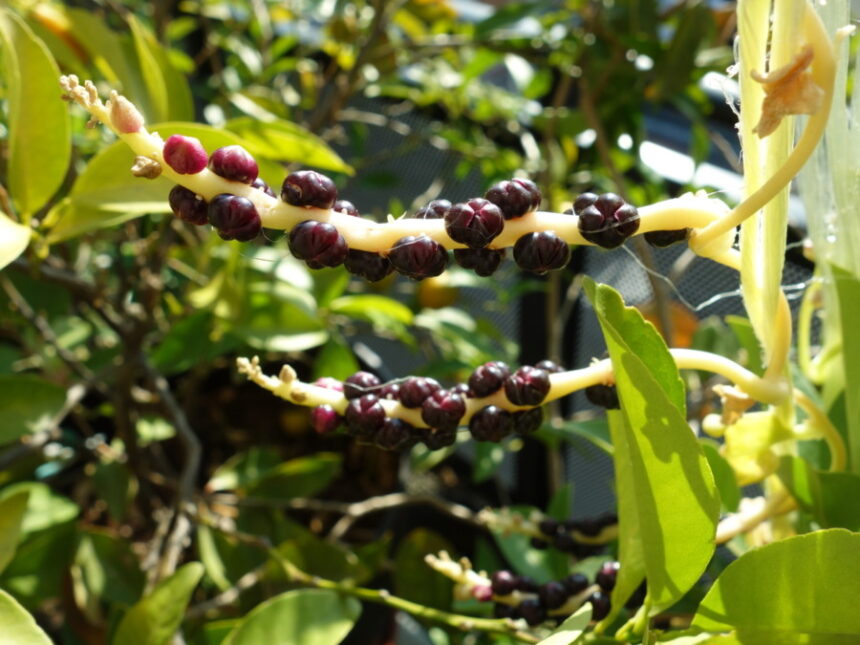 2023年10月上旬には種ができていました 。それからさらに2ヶ月半ぐらい経った時点での別のツルムラサキ緑茎種の種。