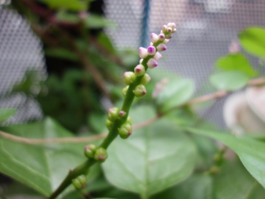 アイキャッチ画像はベランダで栽培しているツルムラサキ赤茎種の花と種。根元の方にあるのが種。