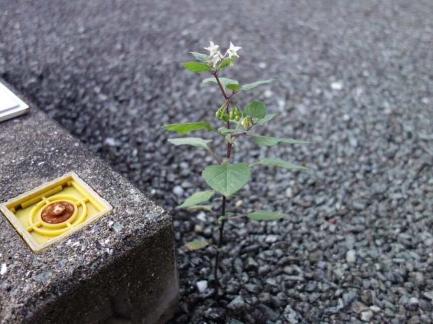 タ駐車場のアスファルト上に生えているイヌホオズキ(犬酸漿)
