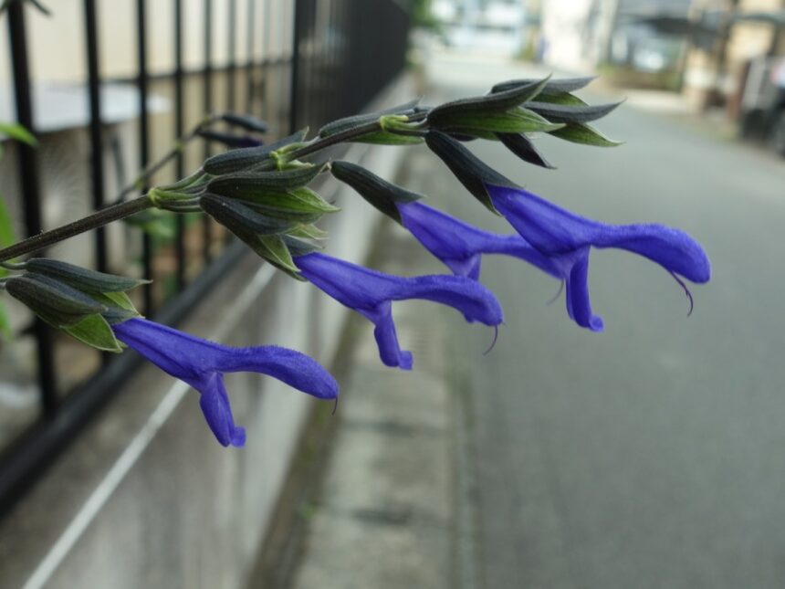 夕方のウォーキングのコース上にある民家の庭に咲いている途中にあるメドーセージという花。柵の隙間から外に出てきているので、道を歩くと花を見ることができます。蛇が口を開けているように見えます。別名はサルビア・ガラニチカ。学名はSalvia guaranitica。サルビアの仲間のようです。英語名はBlue anise sageとかAnise-scented sageとかあります。メドーセージは日本国内のみの流通名とのこと。原産地は南米、メキシコ、ブラジルのようです。