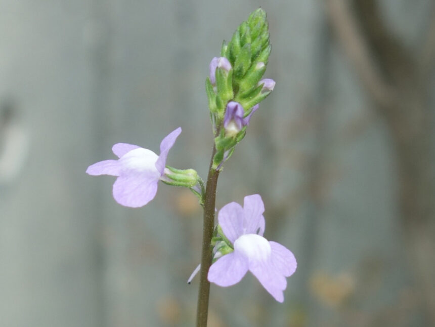 公園の近くの企業の門の横に咲いていた咲きかけのマツバウンラン(松葉海蘭)。