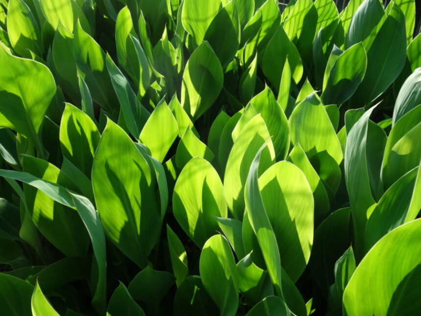 夕方のウォーキングの時に公園のカンナの葉っぱが夕日に映えていました。 このカンナには黄色い花が咲きます。