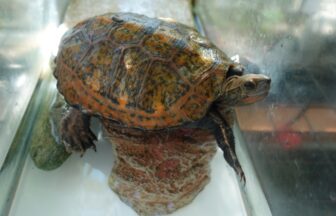ガラス水槽の中で側壁にもたれ掛かっている飼育1150日のシナスッポン♀。燕尾服を着ているように見えないこともないで…