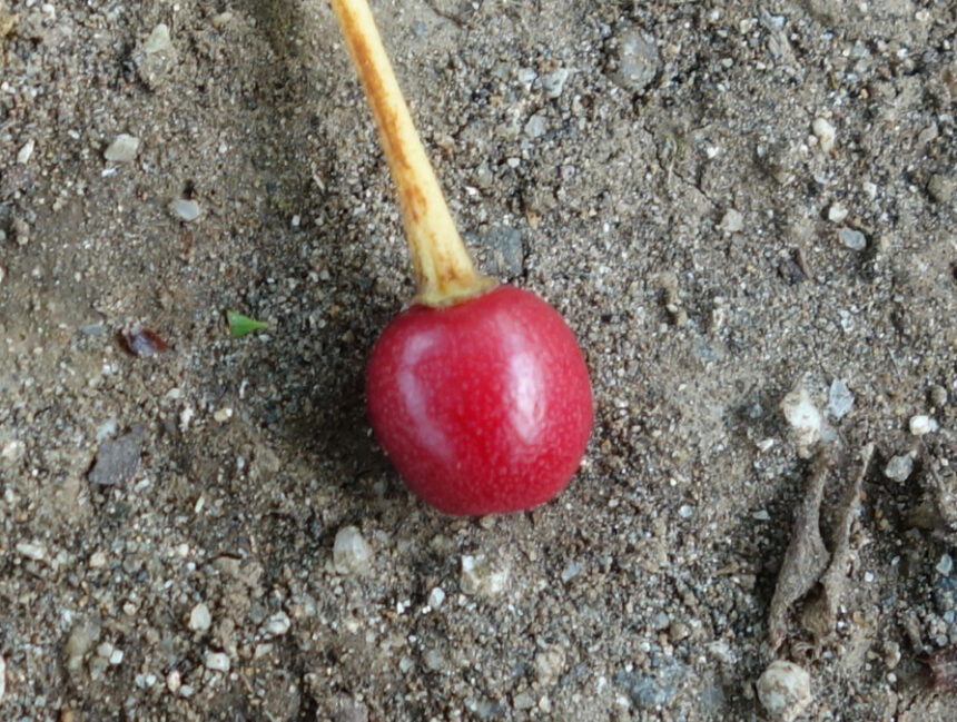 ソメイヨシノの樹の下に落ちていた赤いさくらんぼアイキャッチ画像を切り取って拡大する前のオリジナル画像。