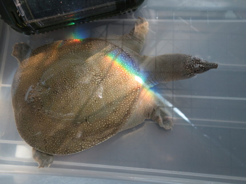 リビングルームの収納BOXの中で虹の七色がかかっている飼育1609日のスッポン♀。名前はチビチビ。