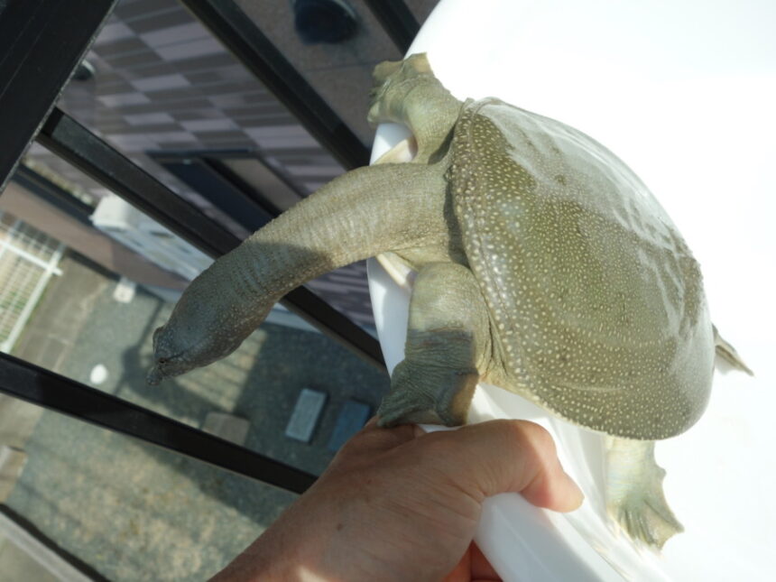 階段の踊り場でたらいに入れて日光浴させている飼育1275日のスッポン♂