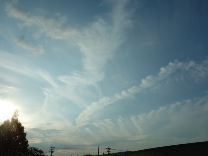 夕方のウォーキング時に公園で見た西の空。不思議な雲を写真に収めました。(2023年9月12日17:19撮影)