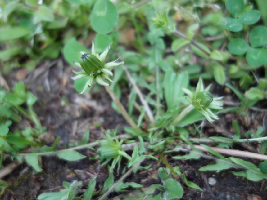 公園の固い地面に生えていたタンポポの蕾。 (2023年3月24日17:17撮影)
