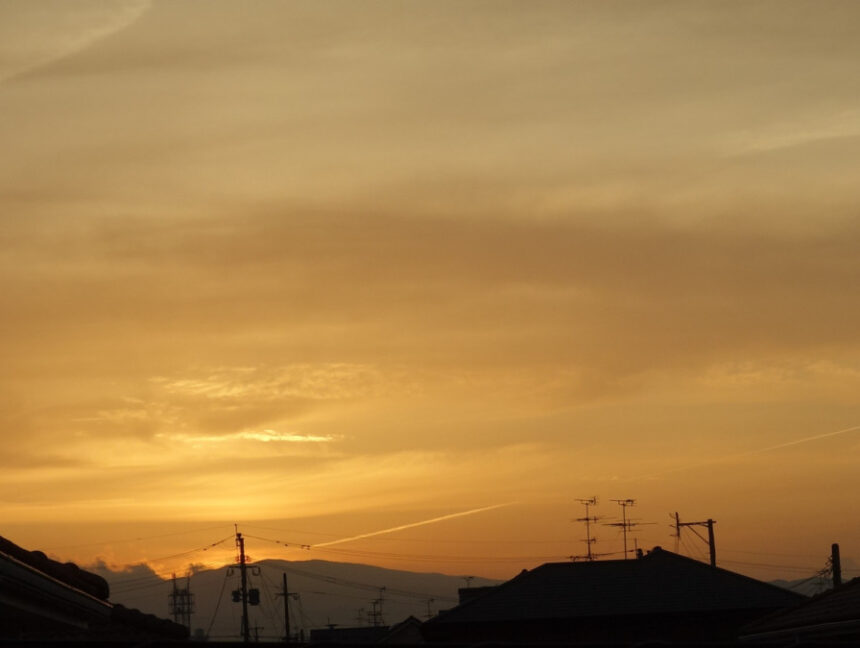 空をもっと広範囲に見ると飛行機雲が数本確認できます。今日は曇るかもしれません。(2023年4月4日6:14撮影)