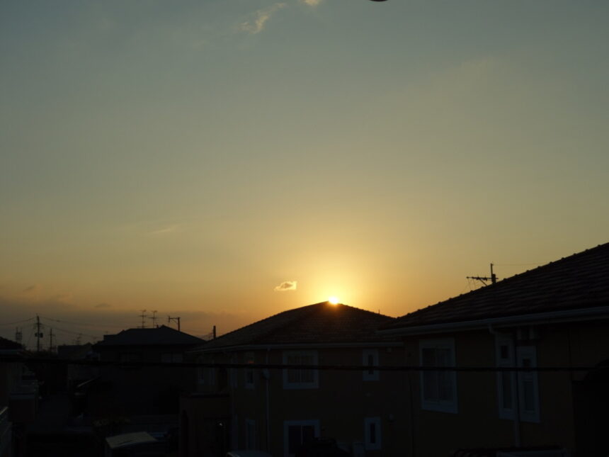 ベランダから見た2023年10月15日の早朝の東の空。昨日は曇りだったので朝日は見れませんでした。今朝は屋根の頂点の右側(少し下がったところ)から昇ってきました。たった2日で左側から右側になりましら。昨日見えていたらちょうど屋根の頂点に出てきたことでしょう。一昨日の朝は6:38でしたが、今朝は6:39でした。少しずつ遅くなっています。