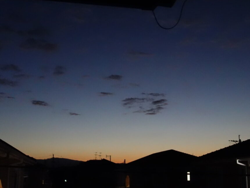 ベランダから見た2023年10月29日の夜明け前の東の空。夕方の西の空にもこのような色が見えることがあります。太陽光が大気圏を通過する距離が夜明け前と夕方に最も長くなるので、いろいろな可視光の波長のうち、一番長い波長である赤色の光だけが物質に当たらずに(散乱せずに)通過できるので、私たちの目には赤く見えます。