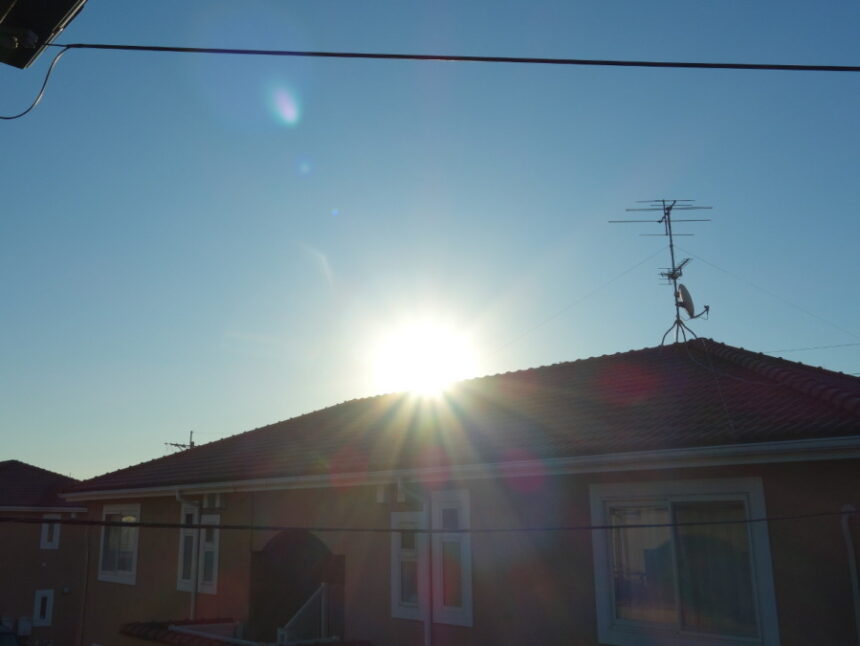 2023年12月24日の早朝のベランダから見えた東の空。冬至の2日後です。太陽が昇った位置はあまり変わらないように見えました。少し戻ったでしょうか。理屈では戻っているはずですが・・・