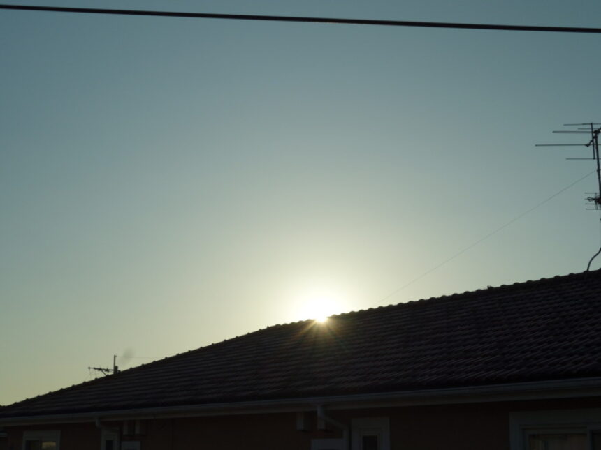2024年1月1日の朝の東の空。冬至から10日経ちました。太陽が昇った位置は屋根の瓦の数でわかるのですが、北側に戻ってきました。昇る時間も早くなっています。
