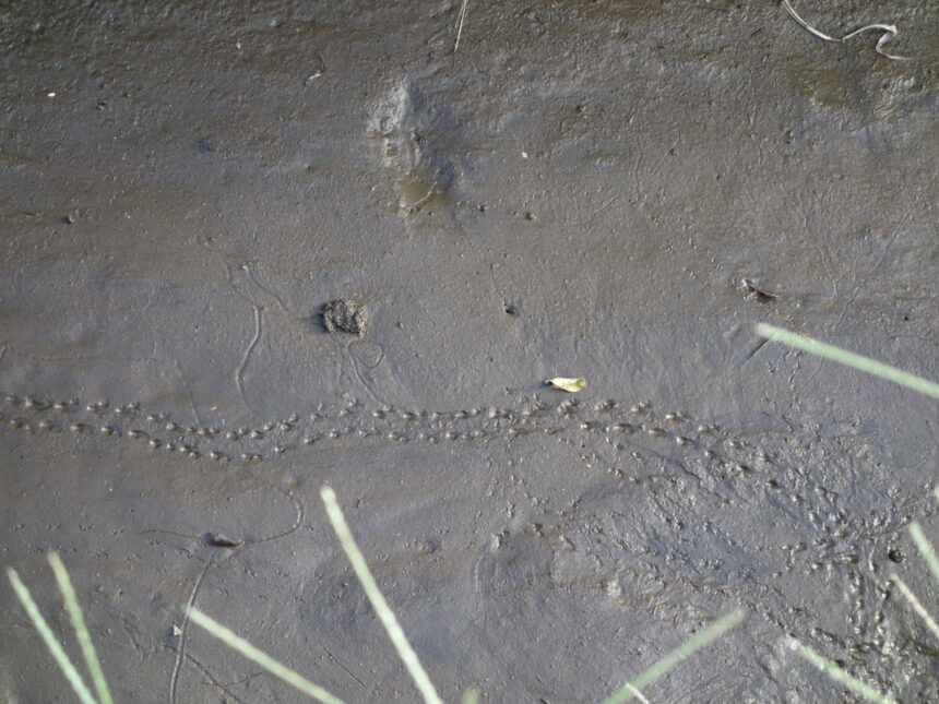 水のなくなった用水路の赤ちゃんスッポンの足跡