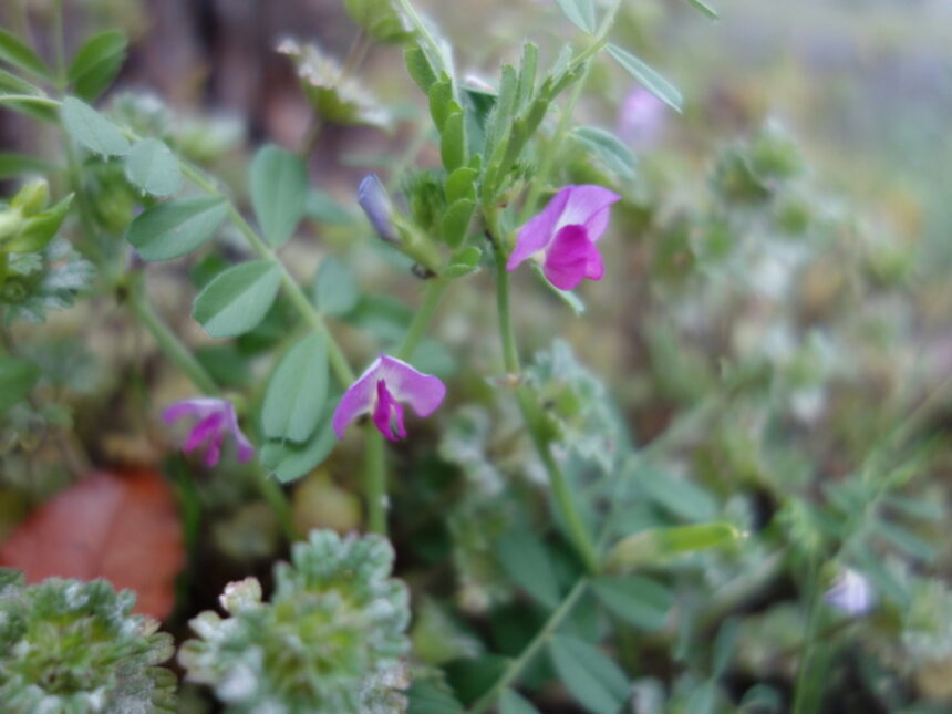 公園の生垣の下に生えていたカラスノエンドウの花。 (2023年3月24日17:29撮影)