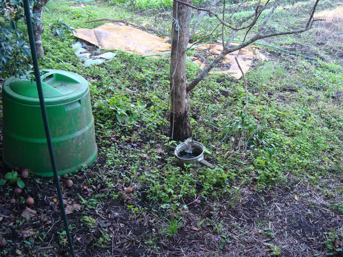 太秋の木の根元には果物の種等をよく捨てていたのですが、そこからブドウの種が発芽して、どんどん育ってきました。苗が小さいうちは草取りで抜かれてしまいがちですが、幸運なことに生き残りました。ある程度生長すると、もう抜かれることはありませんので安全です。品種が何だったのかはわかりませんが、巨峰あたりではないかと思われます。実生なのでたとえ実が生ったとしてもどんな実になるかわかりませんが、せっかく育って来たのを処分するのももったいないので、このまま様子を見ていきます。