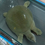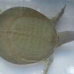 黒い底板のガラス水槽から半透明のポリプロピレンの収納BOXに換えてから体色が緑がかってきた日齢1416日のスッポン♂。現在の甲長は18cm。