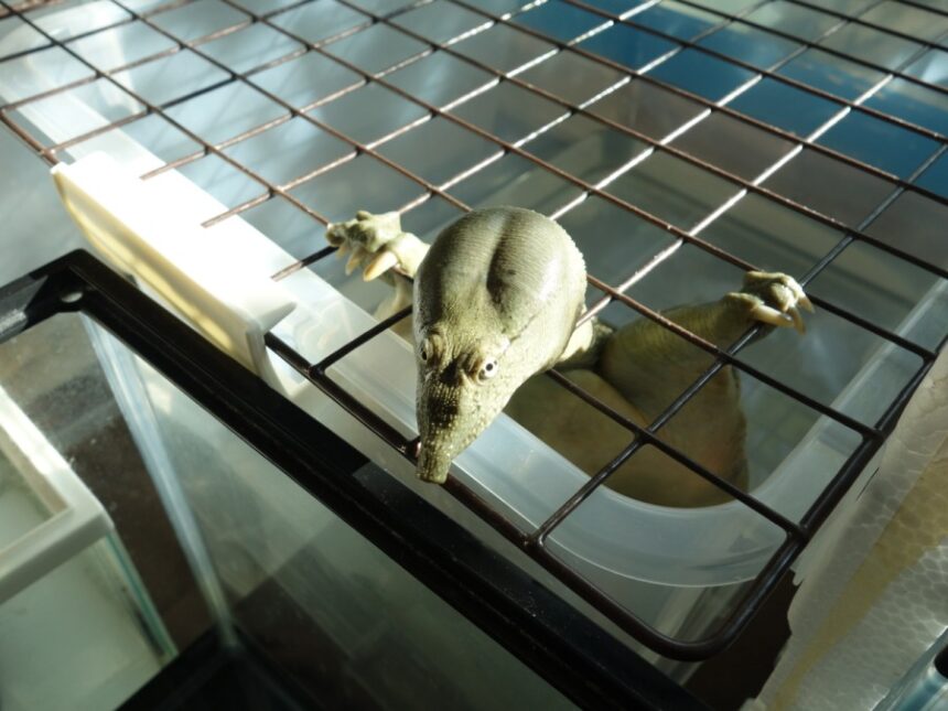 日齢1540日の5匹のスッポンのうち、2番目に大きい個体♂が収納BOXにかぶせたワイヤーラティスから顔を出しているところを撮影。