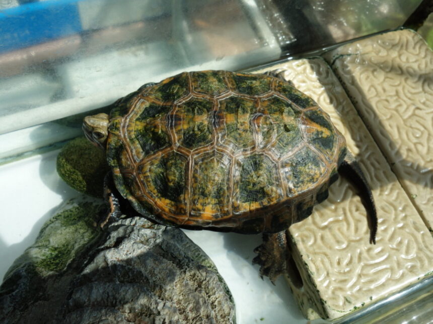 水槽の中で陸場に上がって日光浴している飼育975日目のニホンイシガメ。 (2023年3月19日14:02撮影)