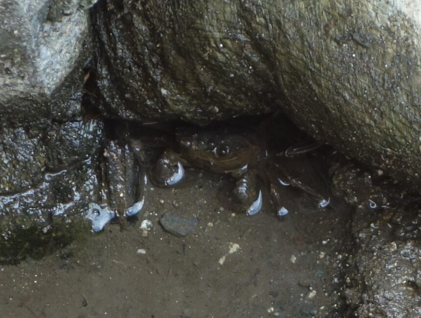 近所の住宅地の側溝に1匹のモクズガニがいました。側壁の下の穴の中にいて、体を半分出していました。9月下旬の用水路の水位が下げられた時からいると思います。私が近づくと警戒してすぐに穴の中に隠れてしまっていましたが、今では隠れなくなりました。馴れたのでしょうか。警戒心が緩んだようです。大きさ的にはあまり大きくありません。この側溝は生活排水しか流れてこないドブなので、環境としてはかなり悪いです。このモクズガニがいつまで生きられるか心配です。