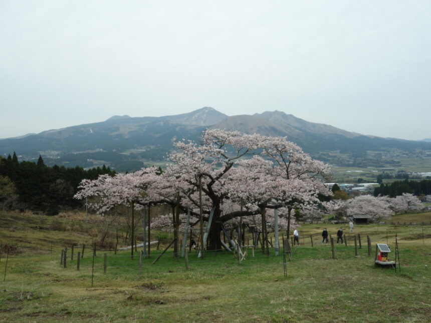 南阿蘇村から見た阿蘇山と観音桜。 (2023年3月30日12:22撮影)