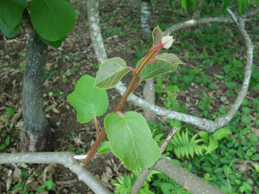 キウイ香緑の蔓から新芽が出ていました。 赤い毛が生えています。 (2023年5月3日14:31撮影)
