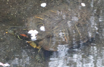 ↑アイキャッチ画像は夕方のウォーキング中に公園の中を流れる用水路にいたミシシッピアカミミガメ。水の中に顔がありますが、…