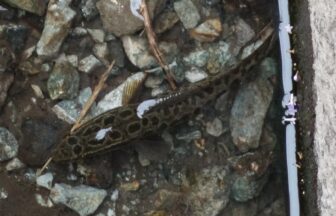 近所の住宅地の側溝に1匹のライギョがいました。水位が下がっていて背びれが水面から出ていました。9月下旬の用水路の水位が…
