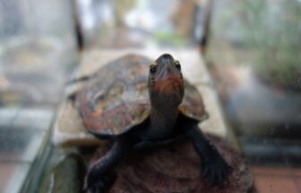 ↑アイキャッチ画像は飼育294日の赤ちゃんスッポン3匹のうちの2匹がガラス水槽の中で甲羅干ししているところ。上が2024年に保…