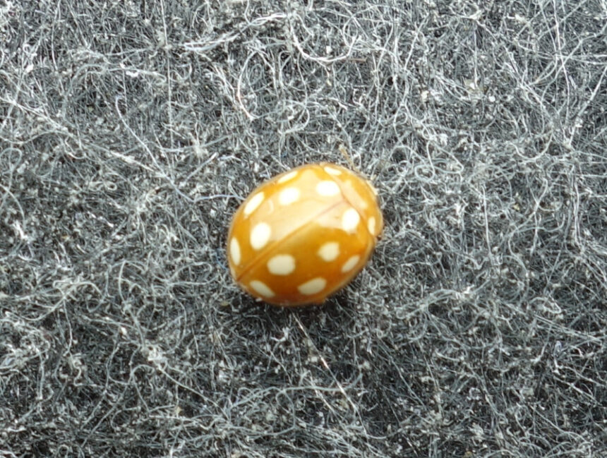 長軸方向の直径は4mmあったかどうかわからないくらいの小さいテントウムシでした。すぐに飛んで逃げました。