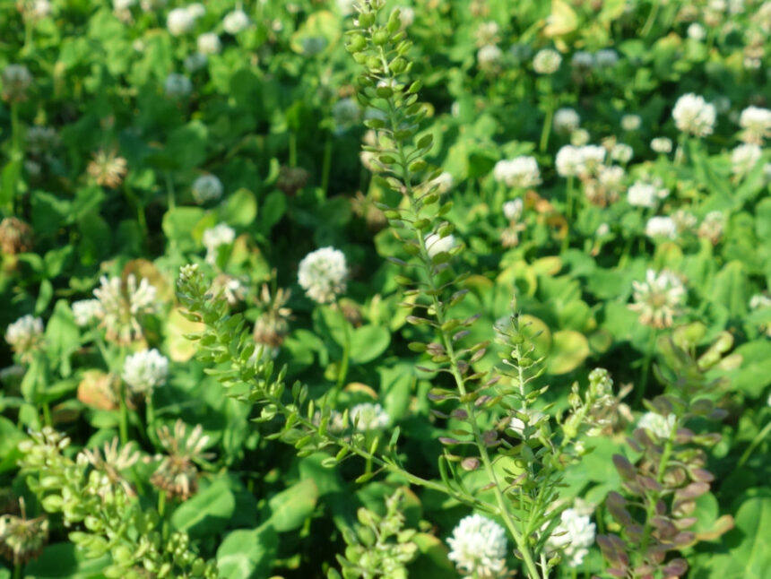 夕方の公園で茂ったシロツメグサの中に実が生ったマメグンバイナズナ(豆軍配薺)。