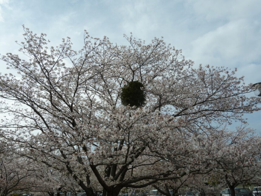 満開のソメイヨシノの木の上に寄生しているヤドリギ(宿り木、寄生木)。 (2023年3月31日15:43撮影)