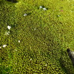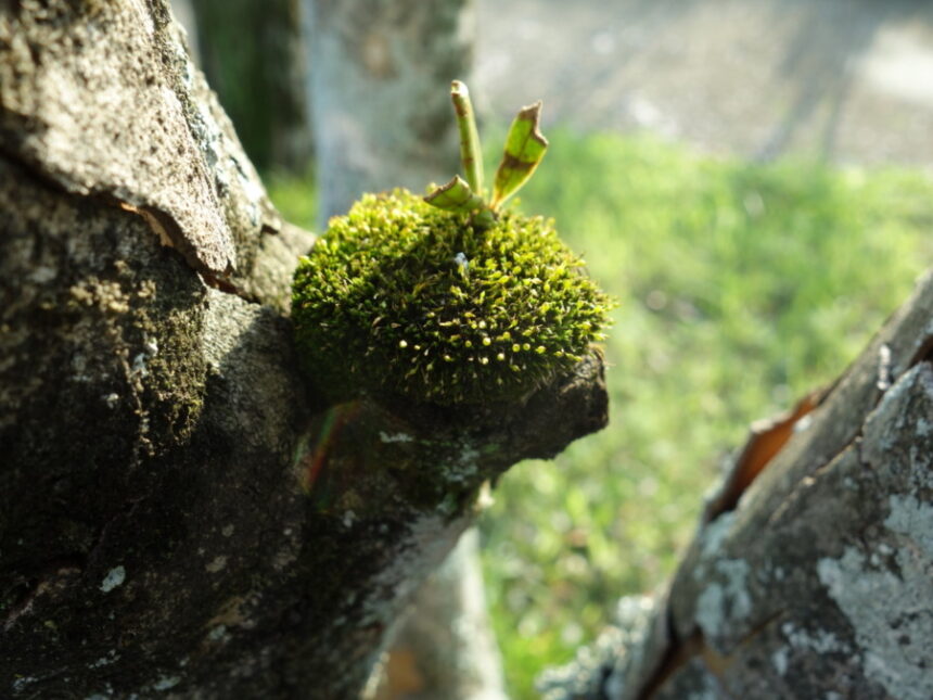 公園に植えてある木が枯れていました。 その木の幹に枝を落とした部分があって、そこに苔が生えていました。 (2023年4月7日17:29撮影)