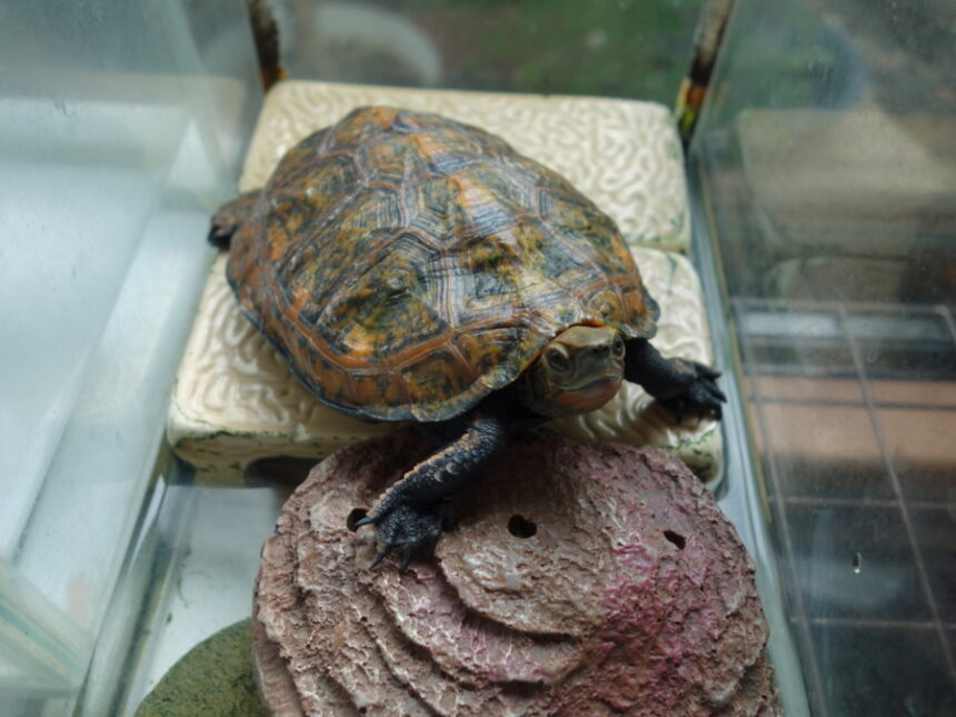 ブロックの上にいる飼育1161日目のニホンイシガメが足を投げてリラックスしています。