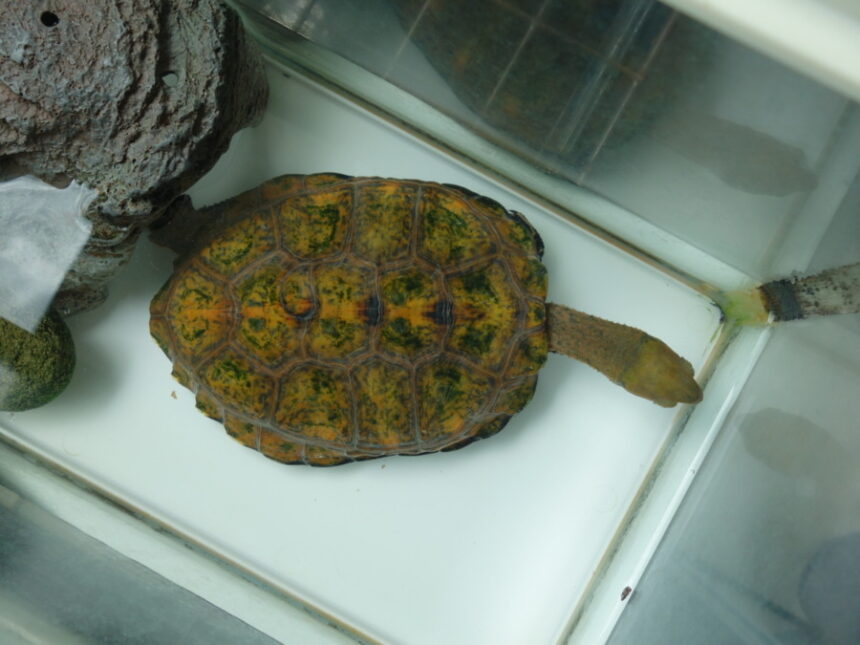 水の中にいる時の甲羅を見ると、藻がだいぶ取れてきたのが乾燥時よりわかりやすいです。(2023年8月8日14:36撮影)