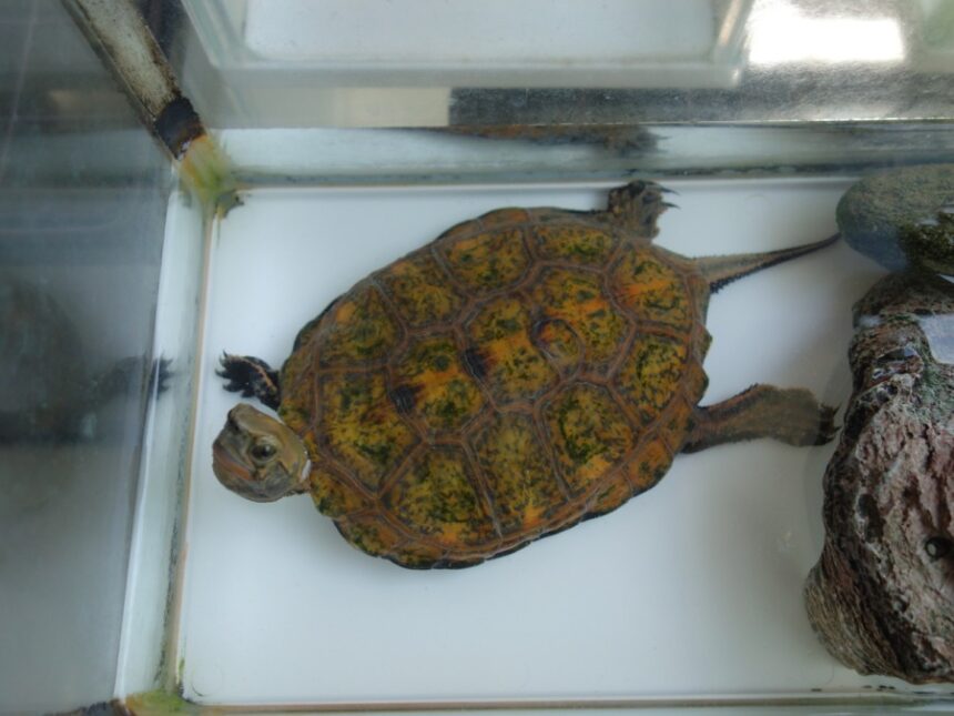 水槽の中でリラックスしている飼育1135日目のニホンイシガメ(2023年8月27日10:05撮影)
