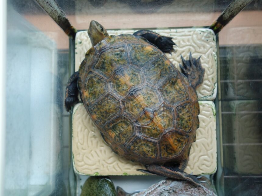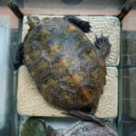 水槽から陸場に上がってリラックスしている飼育1144日目のニホンイシガメ(2023年9月4日15:07撮影)