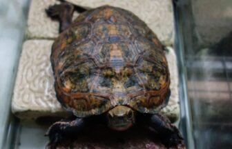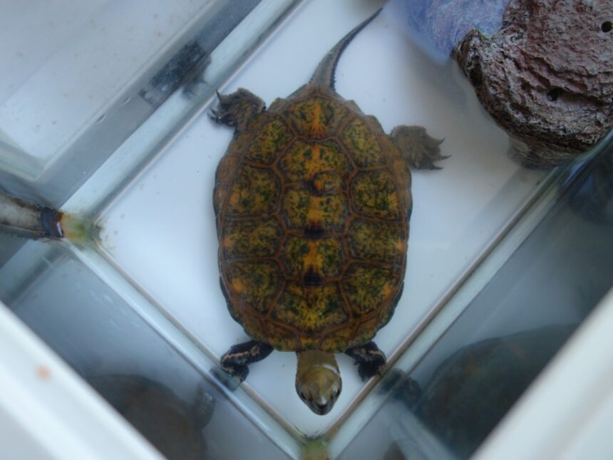 水の中にいて飼い主を見ている飼育1145日目のニホンイシガメ。(2023年9月5日15:18撮影)