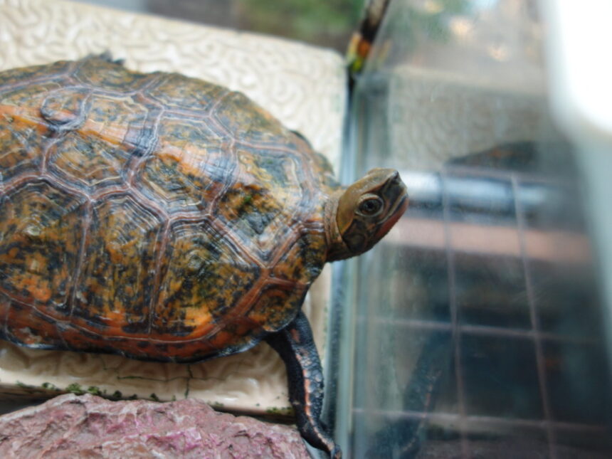 ブロックの上にいる飼育1159日目のニホンイシガメ。(2023年9月19日16:19撮影)