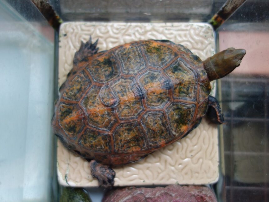 飼育1184日のニホンイシガメが甲羅干ししているところ。